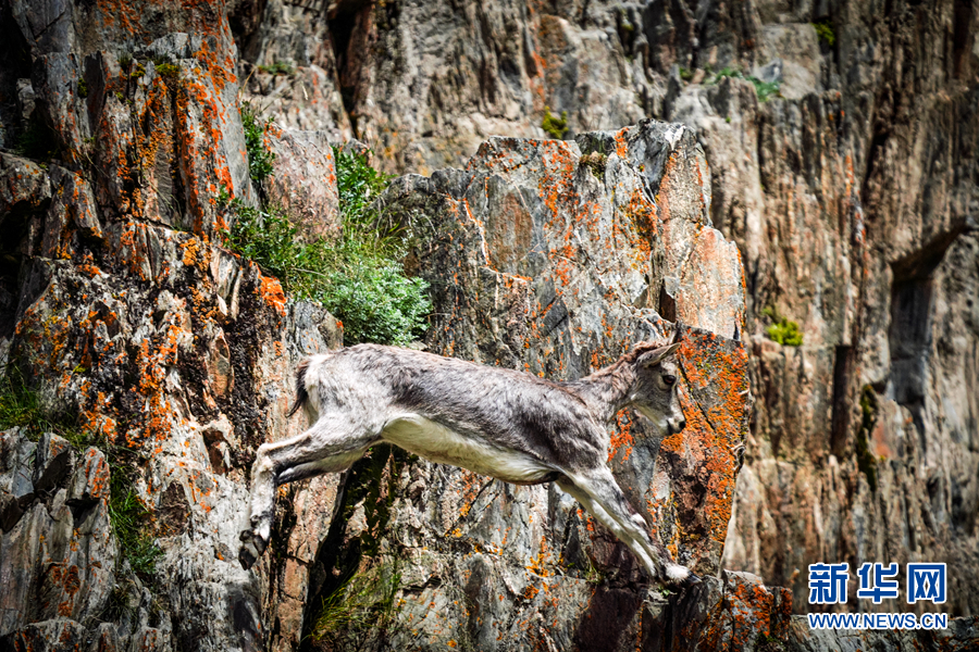 一只岩羊在岩壁上跳跃。新华网 宋忠勇 摄