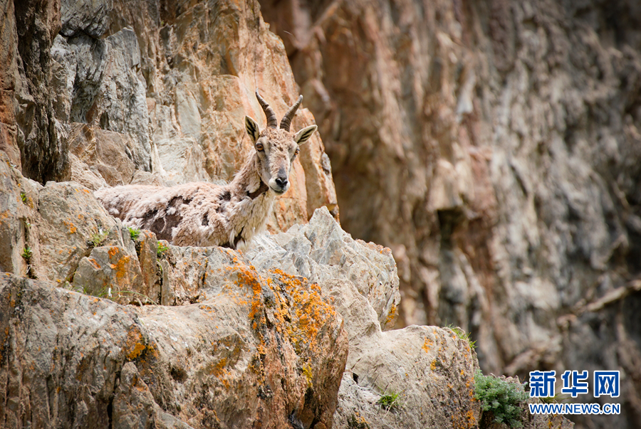 两只岩羊站在岩壁上俯瞰。新华网 宋忠勇 摄