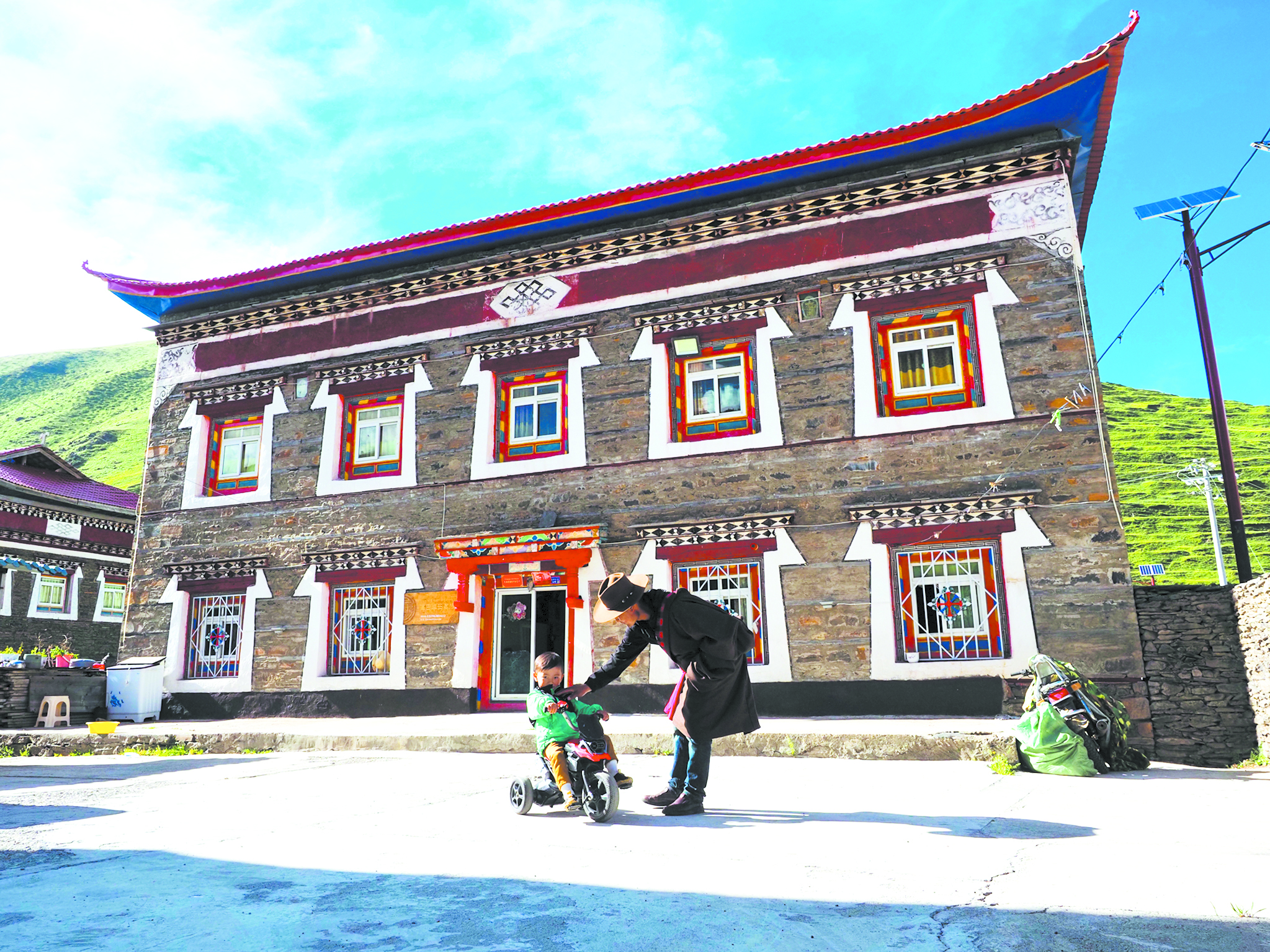 丁真汪秋陪儿子在自家改造的民居前玩耍。于谭阳 摄
