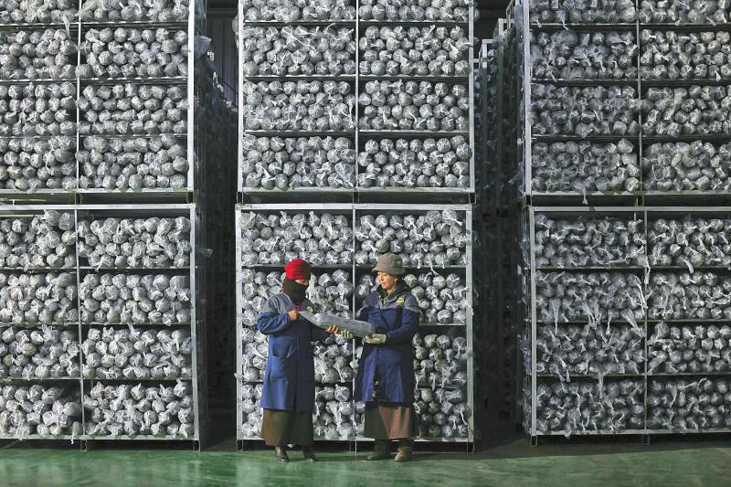 1月4日,松茸产业园的管理人员在仓库里整理即将发放给当地种植户的滑子菇菌包。尹钢 摄