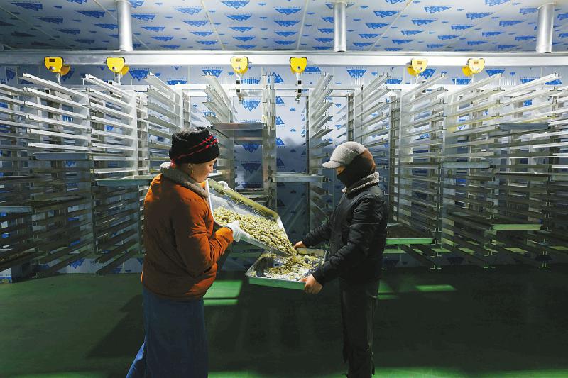 1月5日,松茸产业园的工人通过真空冷冻干燥设备加工冻干食用菌。尹钢 摄