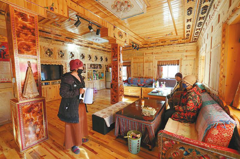 八角楼乡帕姆林村的白马翁姆(左)是产业园的接种工,每月收入4000元。1月5日,她在新家客厅接待外地来的客人。尹钢 摄