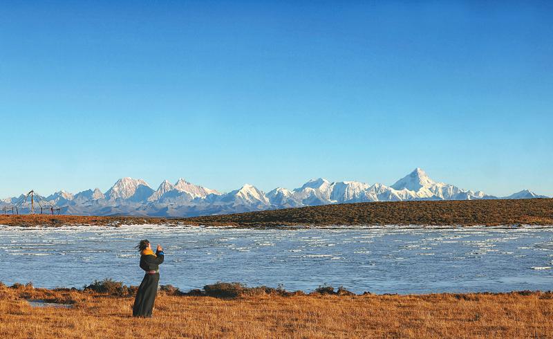 2020年12月16日,八角楼乡木泽西村的首批大学生卓玛在贡嘎山下进行菌类资源调查时,祈盼青山绿水常在。尹钢 摄