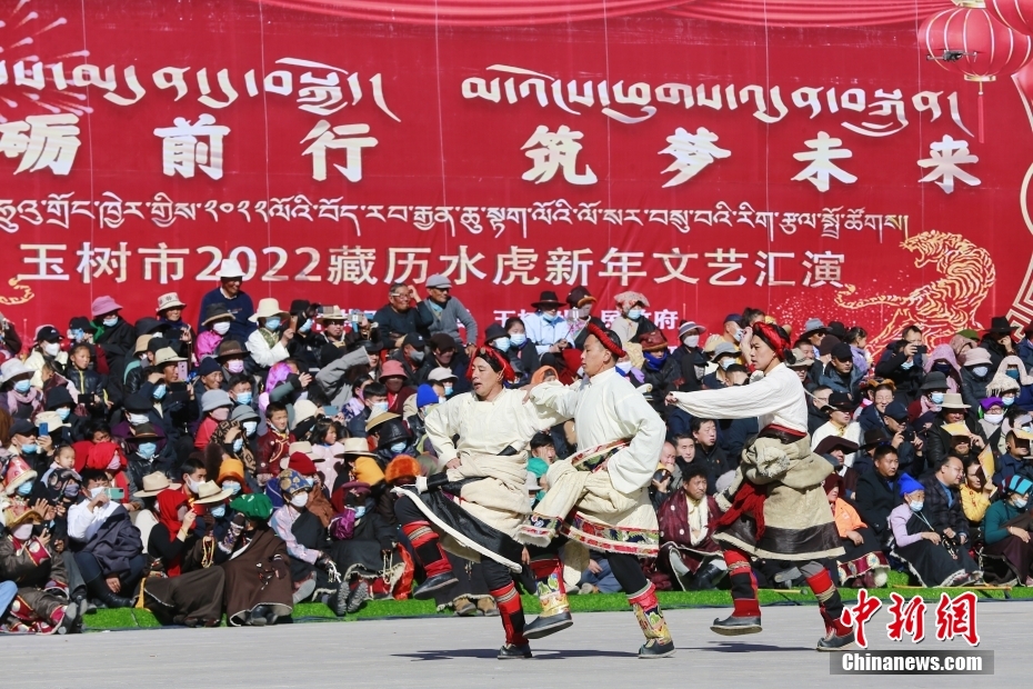 3月3日,在青海省玉树藏族自治州玉树市,藏族民众进行歌舞表演,共庆藏历水虎新年。当日是藏历水虎新年正月初一,玉树市藏族民众身穿华丽服装,跳起欢快的藏族舞蹈,共庆藏历水虎新年。部分民众来到嘉那玛尼石经城转经朝拜,煨桑祈福新的一年五谷丰登、吉祥如意。中新社记者 马铭言 摄