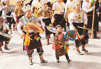 “咚,咚,咚”,踏步、击鼓、起舞,60多名男舞者身着金色菱形披肩,戴五佛冠吉祥帽,左手执鼓,右手掌鞭,迈开稳健的步子,一步一击,三步一击,边击边舞,不时变换着队形:方阵、螭摆尾、圆形交错换位螺旋绕圈、横排,场面宏大,气势磅礴。