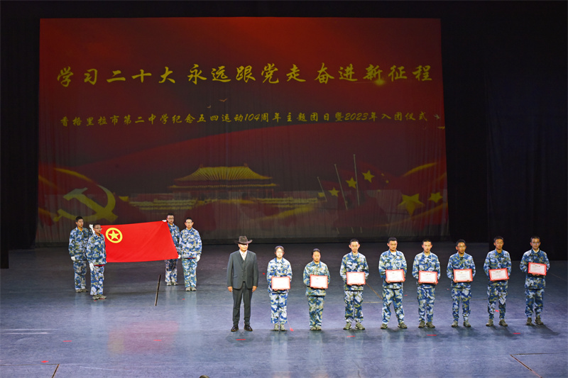 在文艺汇演前,学校为8位优秀团员颁发证书,并举行了纪念五四运动104周年主题团日暨2023年入团仪式,65名新团员佩戴团徽庄严宣誓。