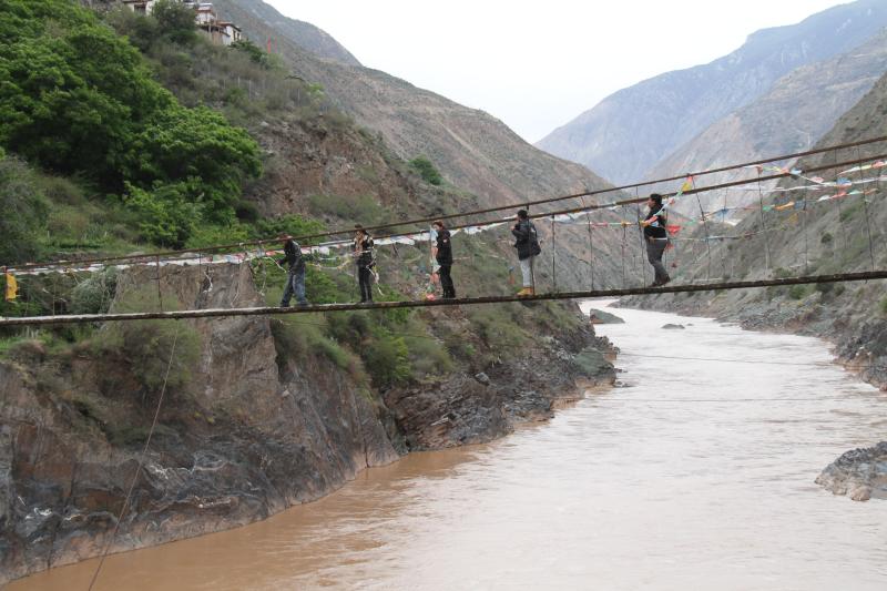 近日,“有一种叫云南的生活”大型调研采访活动德钦分队十多名来自省内外的记者采访团走进佛山乡,茶马古道梅里雪山段澜沧江上的竹篾溜索、铁索桥,以及如今还在使用的便桥引起了大家极大兴趣。三种渡江方式,代表了三个时代的变迁。离此处500米左右下游的钢筋混凝土大桥则是近几年建成的,宽约十米的桥面上汽车轰鸣而过。