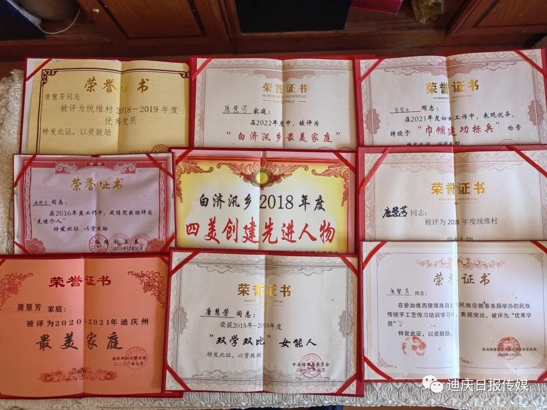 唐慧芳孝老爱亲的精神不仅让自己的公公婆婆能够安享晚年幸福生活,也用实际行动感染了晚辈。她的家庭多次被州妇联评定为“最美家庭”,她多次被县、乡、村评定为“最美人物”“双学双比”女能人、“优秀党员”“巾帼建功标兵”“先进个人”。她用她的朴实真诚诠释着中华儿女尊老爱老、孝老爱亲的优秀品质,她用她的无私奉献践行了一名共产党员甘当群众的“贴心人”的庄严承诺!