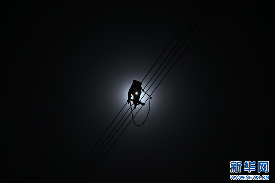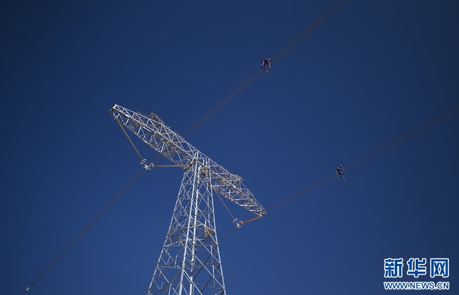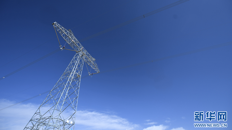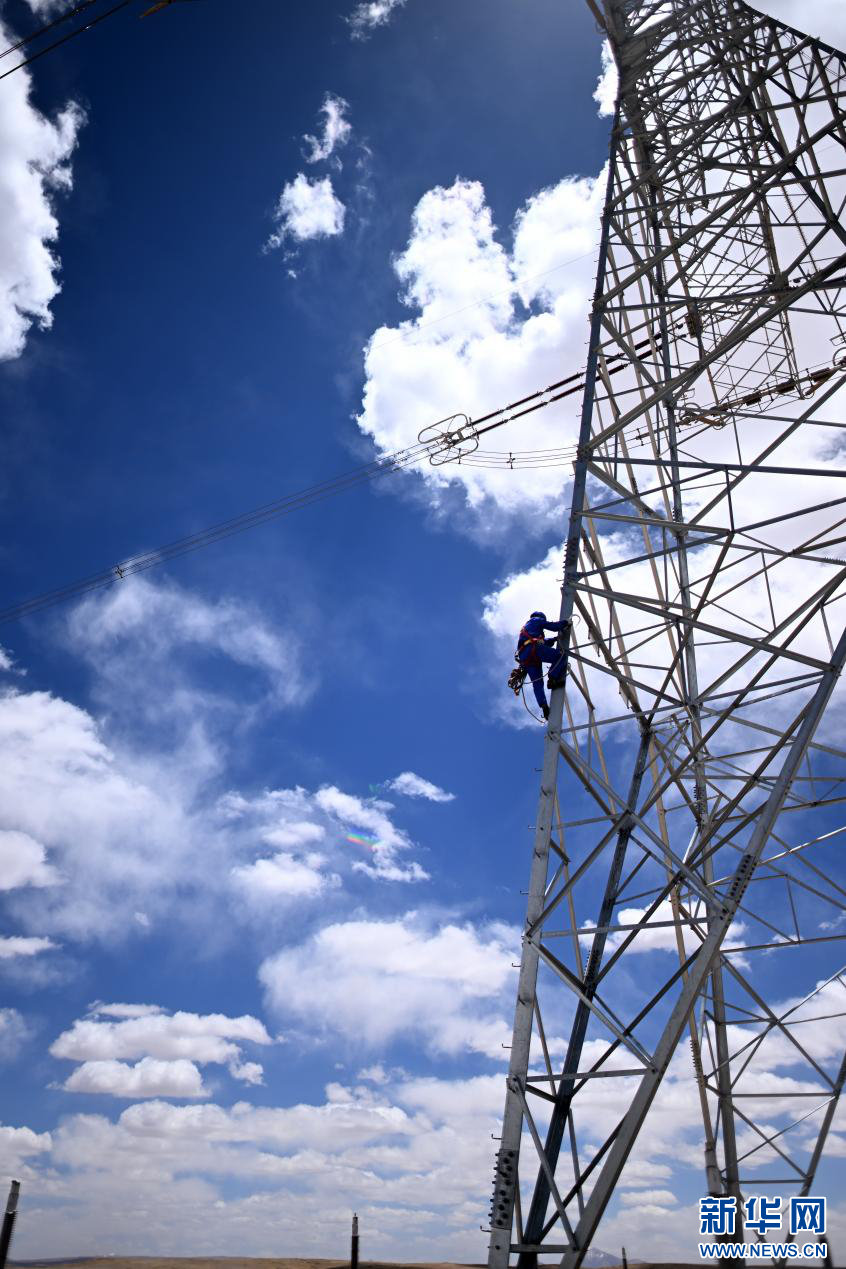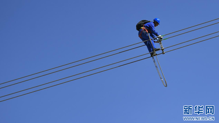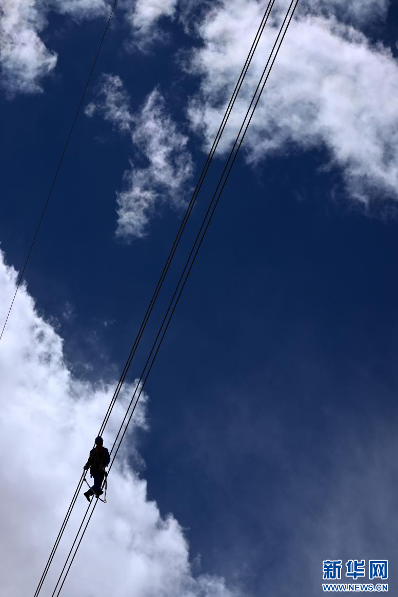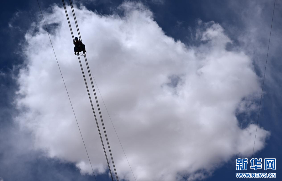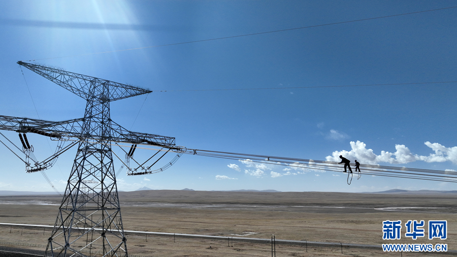 在平均海拔超过4500米的长江源头腹地,检修人员克服高寒缺氧的环境,在云端走线巡检,成为“电力天路”一道独特的风景。新华社记者 张宏祥 摄