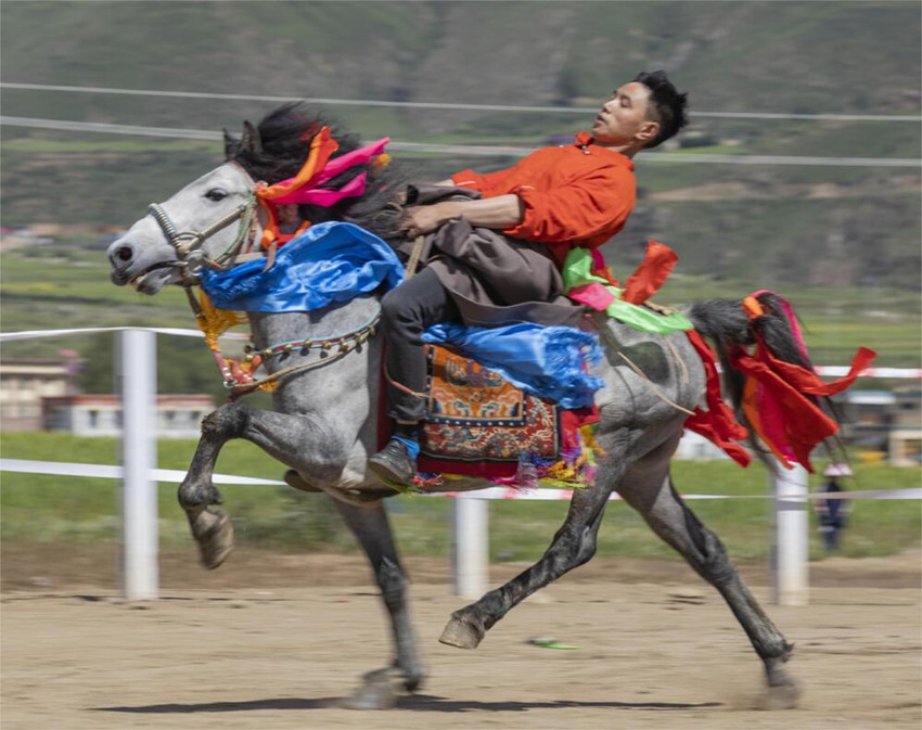 走马赛场尘土飞扬,马儿四蹄快速且有节奏地蹬地,马身却平稳地从眼前呼啸而过,飞速穿过终点,看得人眼花缭乱。7月17日上午,“2023四川甘孜山地文化旅游节”活动之一的走马表演活动,在被誉为“中国走马之乡”的甘孜县来马镇会师走马场上举行,吸引省内外上千游客前来欣赏。