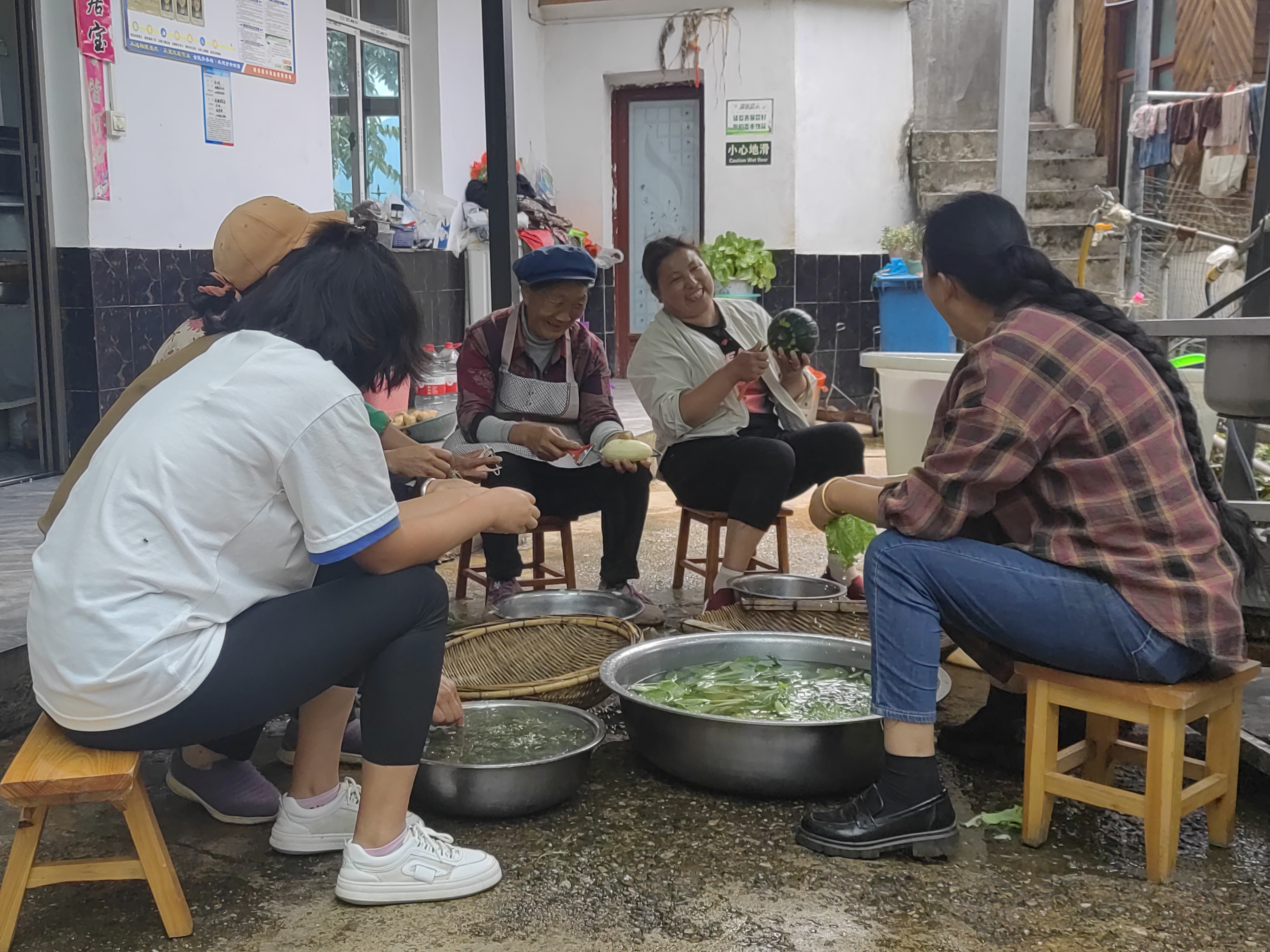 村口,一个名叫“成姐农家乐”的小院里欢声笑语,热闹非凡。“这是今天刚挖的洋芋和新鲜采摘的瓜,待会就给客人做一道当地的特色菜——瓜瓜洋芋。”“炖瓜瓜洋芋的时候,再做个锅边粑粑,这样的农家味道客人肯定喜欢。”在农家乐里忙碌的姐妹们边洗菜边讨论着当天的菜品。