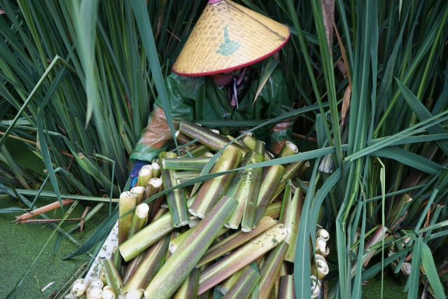 走到田间,只见十余名务工人员脚穿水鞋,头顶斗笠,手拿弯刀向下一挥,再去头割尾,一颗光洁的茭白便采割完成了。采割好的茭白在岸边经过简单清洗后,便运往冷库包装,销往各地。