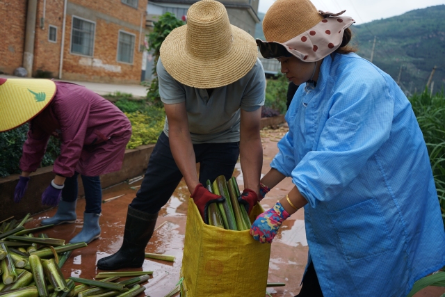 刚从田里采摘的茭白将在冷库集中分拣中心完成称重、分拣、打包和冷库储藏等程序,待低温保鲜后再进行装车,统一运往市场销售。