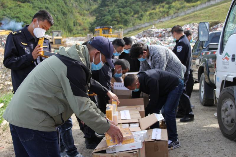 10月13日上午,迪庆州烟草专卖局联合州市场监督管理局、州公安局、州邮政管理局等相关部门,在香格里拉市垃圾处理厂举行了假烟公开销毁活动。