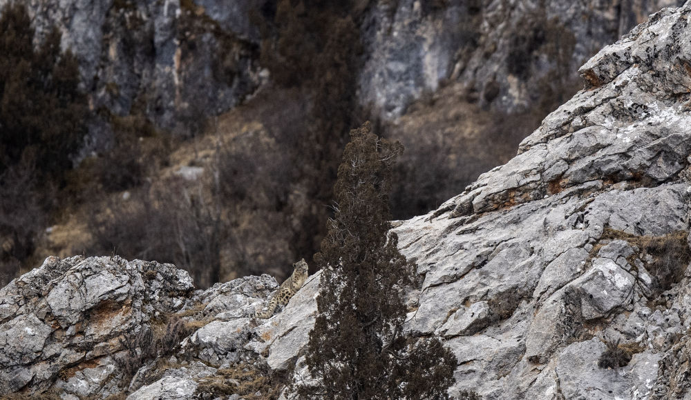 在青海省玉树藏族自治州杂多县昂赛乡境内的昂赛大峡谷内,一只雪豹正在休息(图片摄于2月21日)。新华社记者 张宏祥 摄