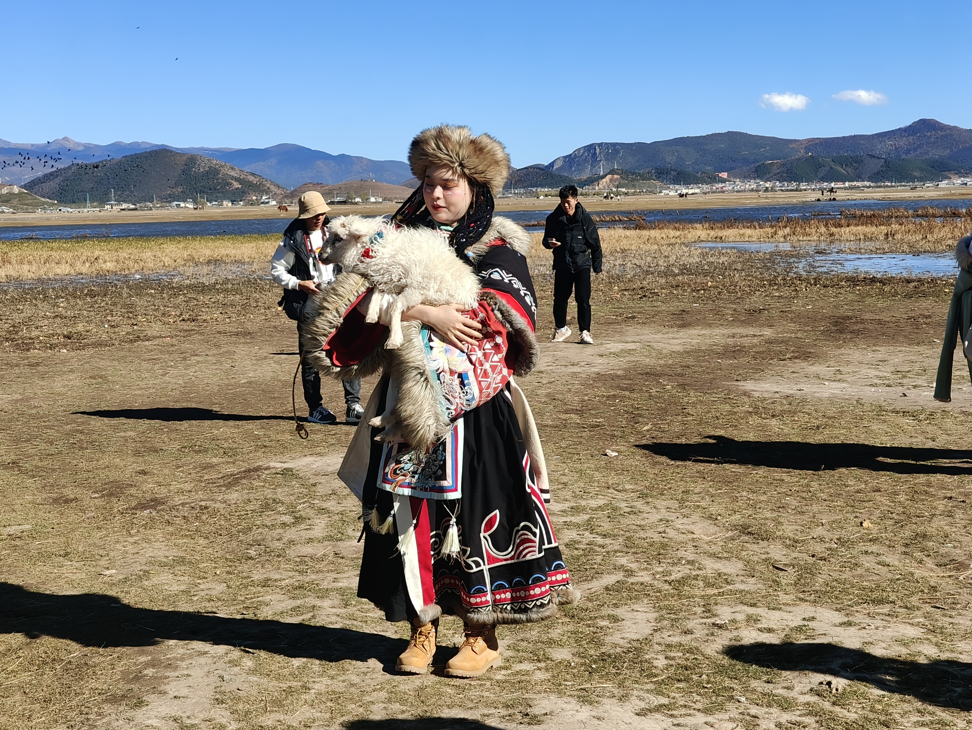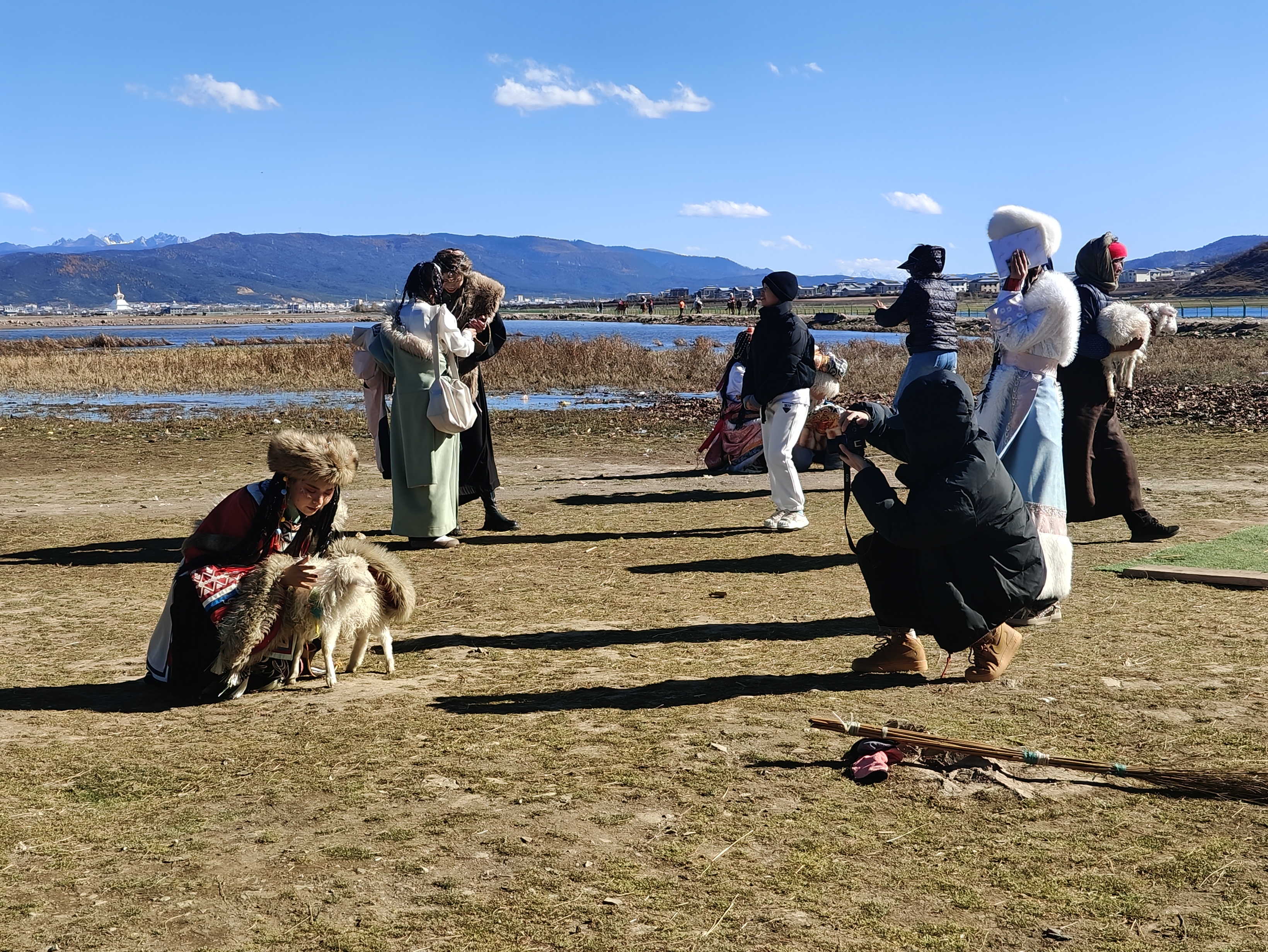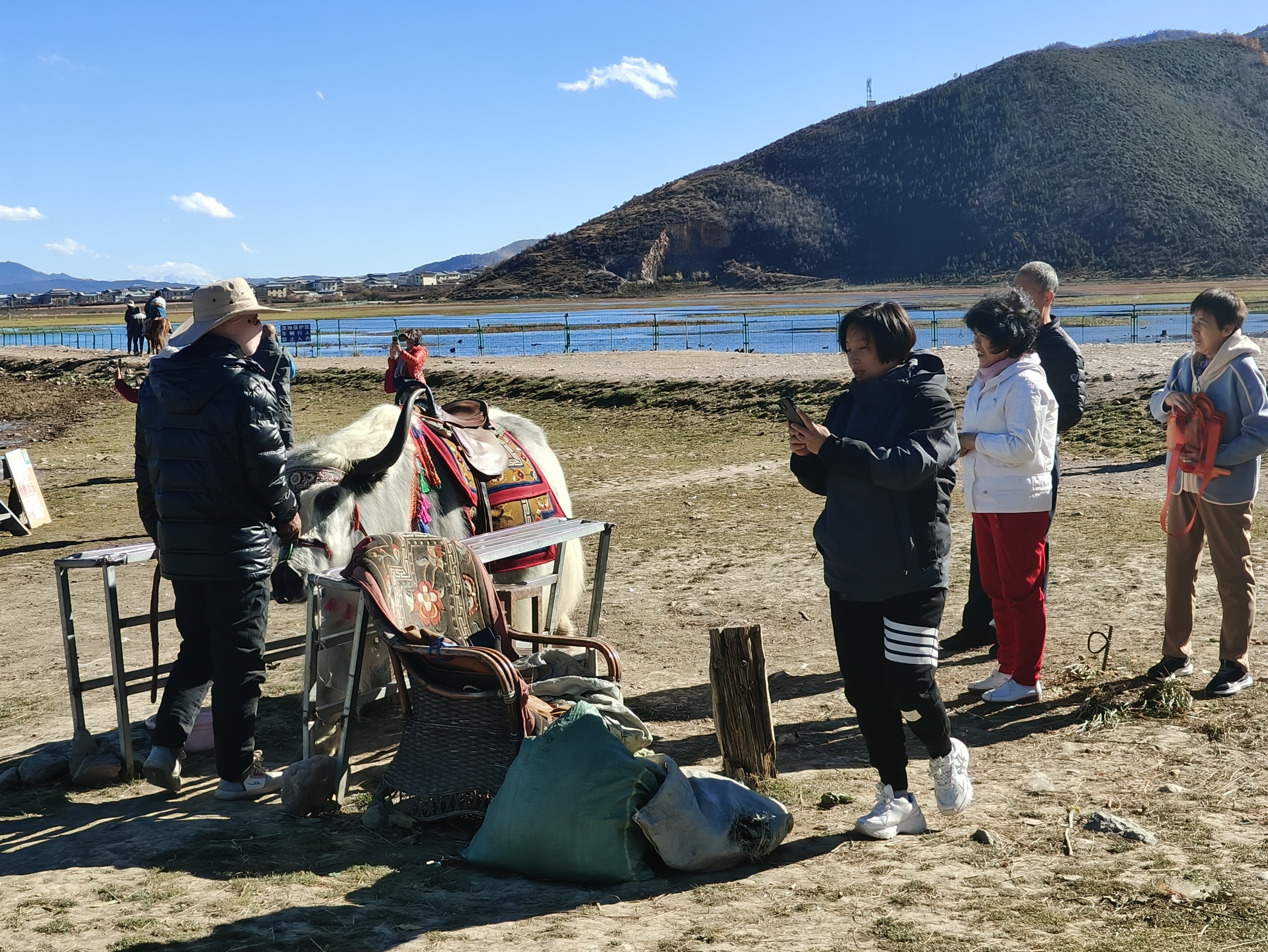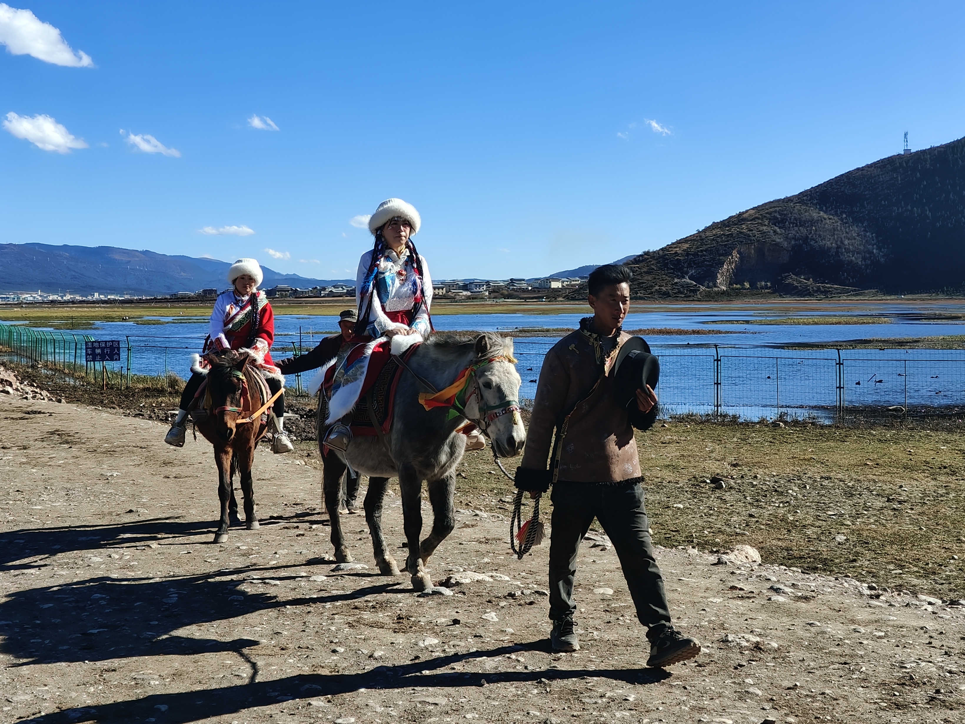 进入11月,迪庆的气温虽然持续下降,但并不影响游客们的游玩热情。纳帕海阳光明媚、碧波荡漾,不少游客选择到纳帕海环湖游,骑行的、骑马的、赏景的、拍照的游客络绎不绝。图为游客在纳帕海湿地骑马,体验藏族马背文化魅力。