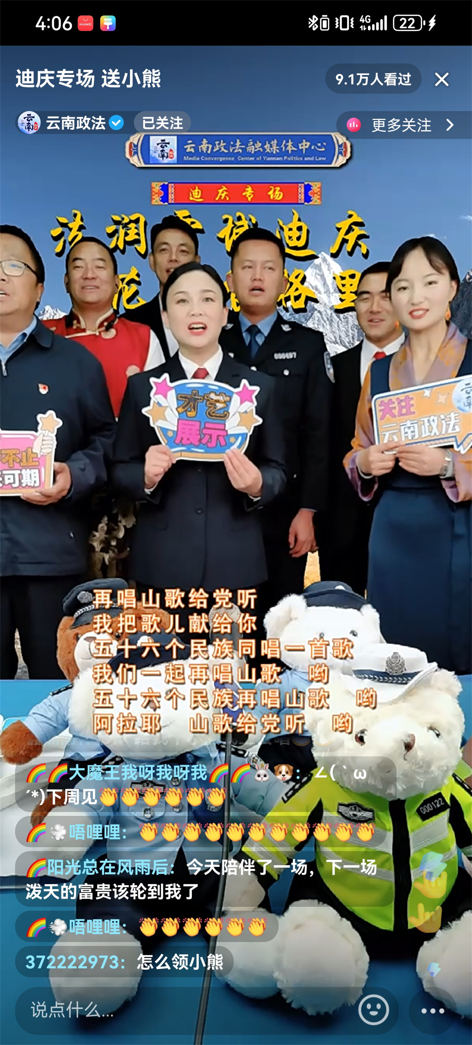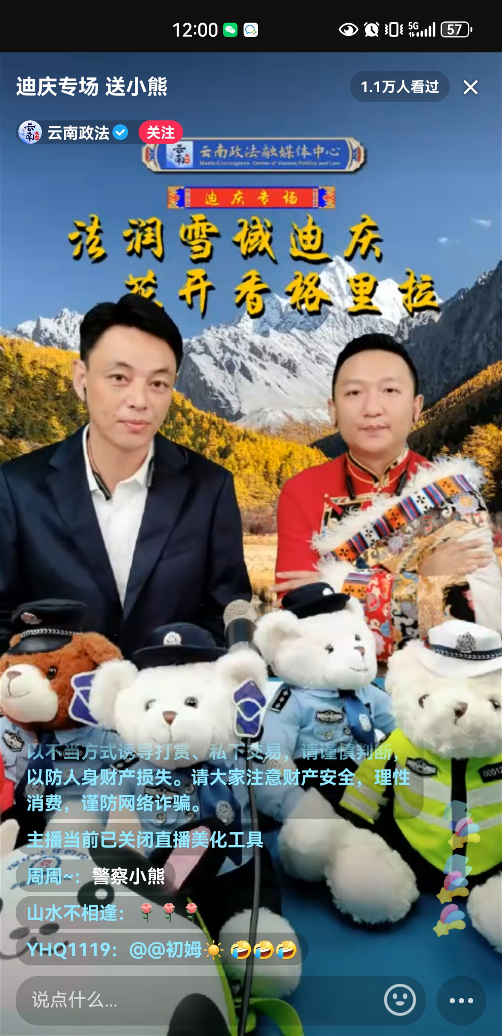 近日,迪庆州政法干警走进云南政法普法强基直播间开展“法润雪域迪庆、花开香格里拉”迪庆州普法专场直播,直播聚焦群众关切,紧密联系时事热点,带广大网友体验了一场内容丰富的普法之旅,共吸引9.1万人观看,获点赞超10.4万。