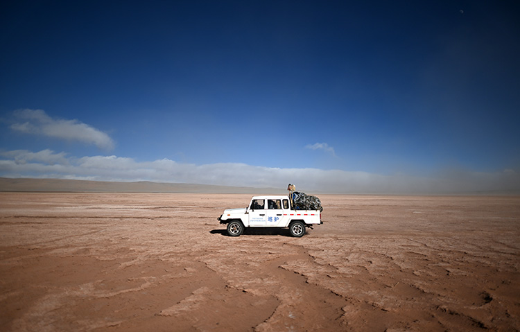 车辆越是深入无人区,空气中氧气含量越稀薄,道路越难走。在颠簸近七个小时后,记者和巡山队员到达了可可西里中心地带、重点巡护区域——卓乃湖。