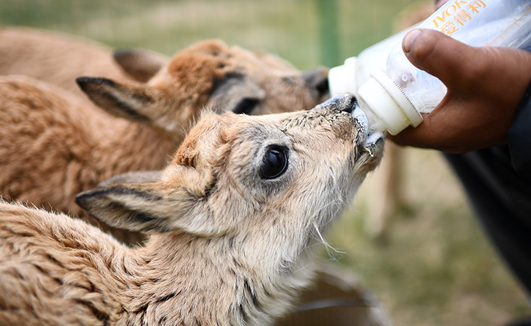 2023年7月28日,可可西里管理处索南达杰保护站队员才仁多杰在给被救助的藏羚羊幼仔喂奶。(张宏祥 摄)