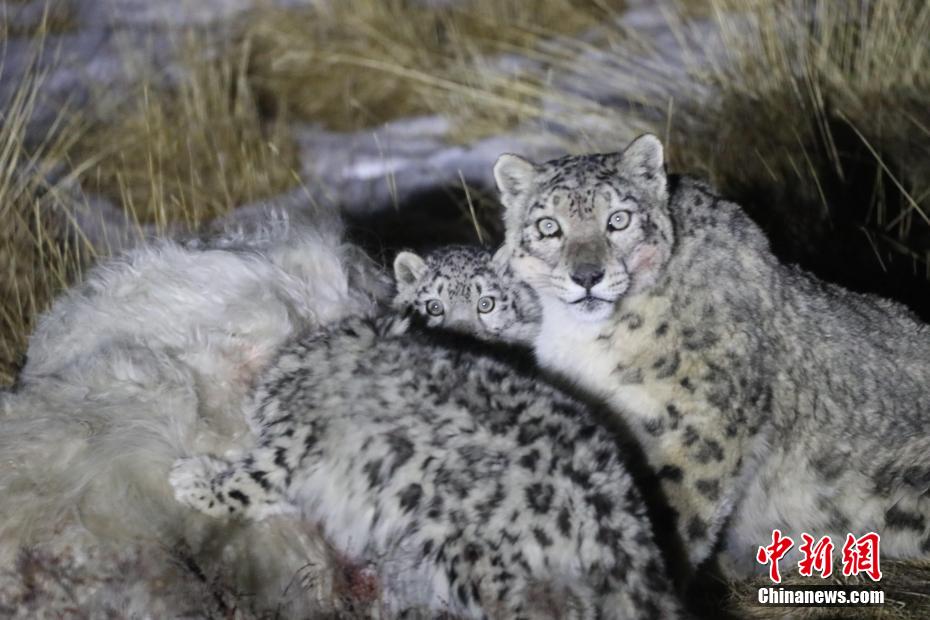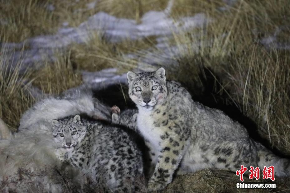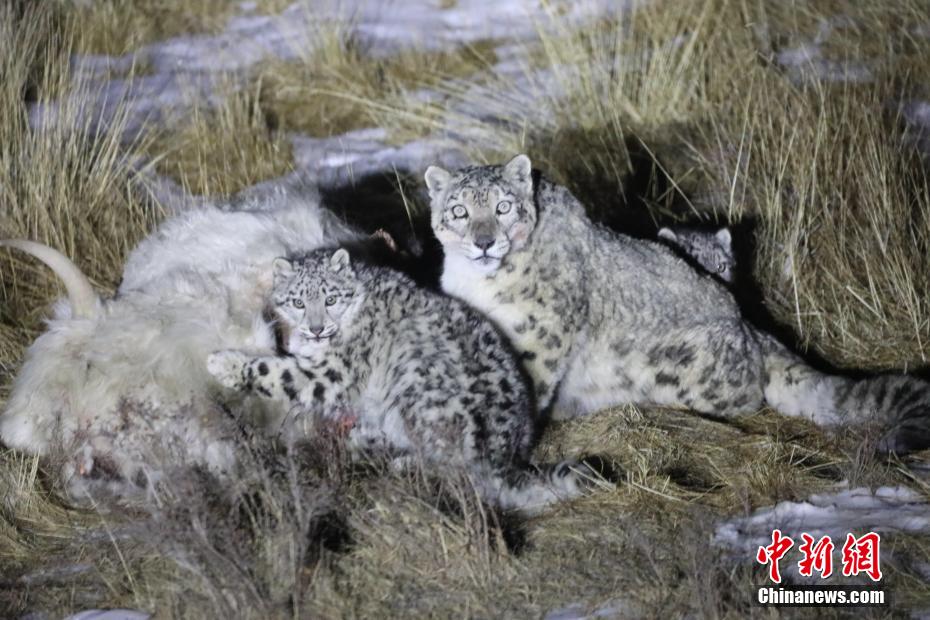 近日,在青海省海西蒙古族藏族自治州天峻县快尔玛乡,摄影师近距离拍摄到3只雪豹进食画面。画面中,3只雪豹正在啃食一只白色牦牛,其中一只雪豹体型较大,大多数时间在“放哨”,其他两只雪豹体型稍小,但一直在“大快朵颐”,吃饱后“欢快”离开。雪豹大多生活在海拔2500米至5000米的高原地区,属国家一级保护动物,被世界自然保护联盟(IUCN)列为濒危物种,由于独来独往,行踪诡秘,又被人们称为“雪山隐士”“雪山之王”。