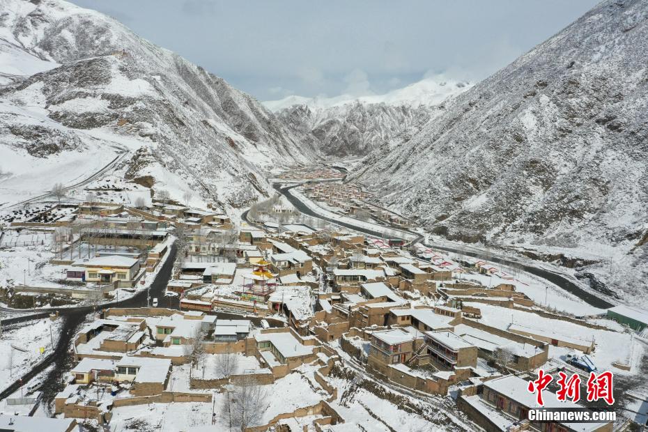 4月10日,航拍青海省玉树藏族自治州壮美雪景。日前,青海省玉树藏族自治州降下春雪,连绵的山峦被积雪点缀,与河流、山庄相映成趣,宛如一幅幅水墨画卷,尽显山河壮丽。