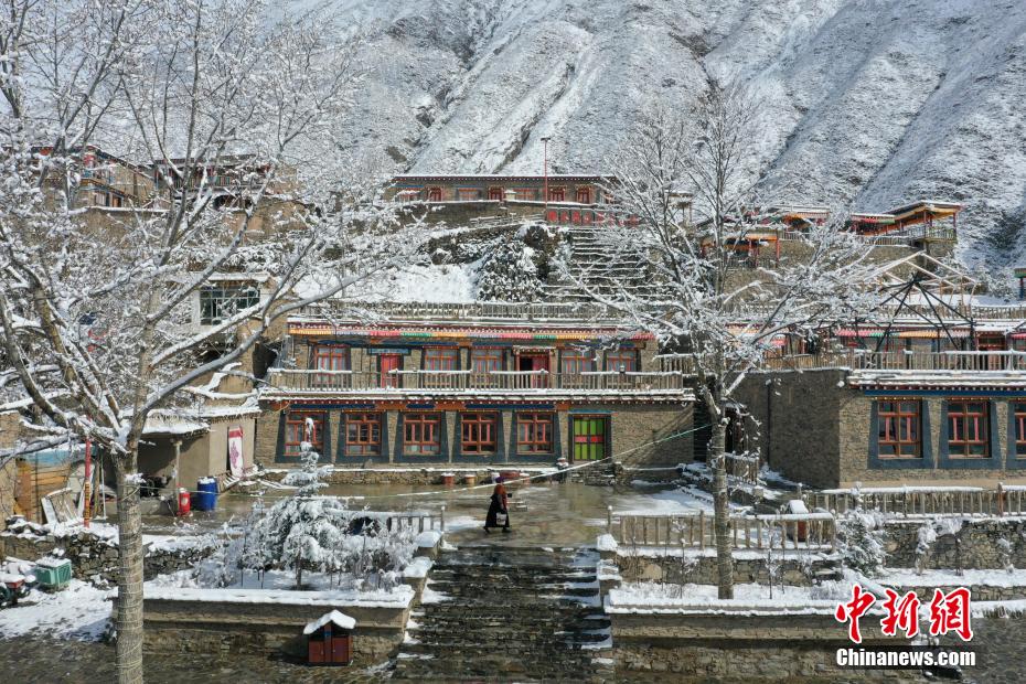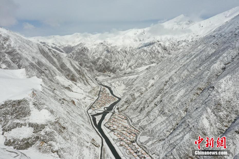 航拍降雪后的青海省玉树藏族自治州玉树市益曲卡山庄。马铭言 摄