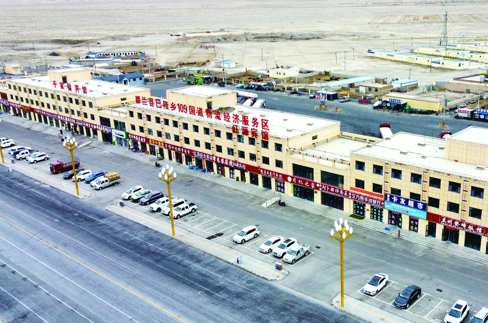 从都兰县城出发,沿着109国道向西行驶100多公里,到达巴隆乡109国道物流经济服务区。整个服务区干净整洁,道路一侧是一排黄色三层小楼,各类商铺云集,楼前的空地上停放着不少车辆。