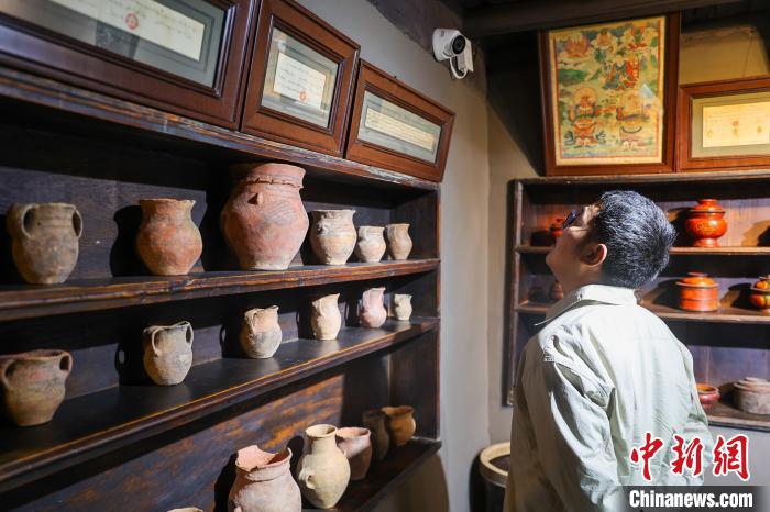 图为参观人员参观古堡内的陶罐。中新社记者 薛蒂 摄