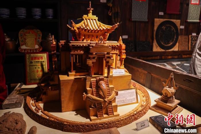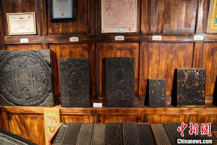 图为古堡内展示的各类印经板。中新社记者 薛蒂 摄