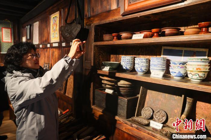 图为参观人员拍摄古堡内的生活器具。中新社记者 薛蒂 摄
