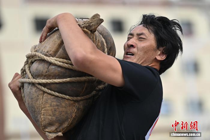 图为举皮袋项目比赛现场。中新社记者 九美旦增 摄
