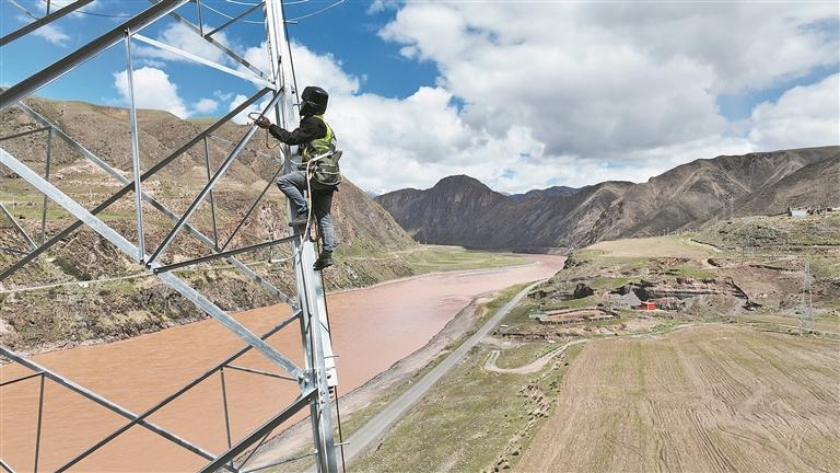 国网青海电力建设人员在330千伏玉树二回跨越通天河段登塔作业。通讯员 王国栋 摄