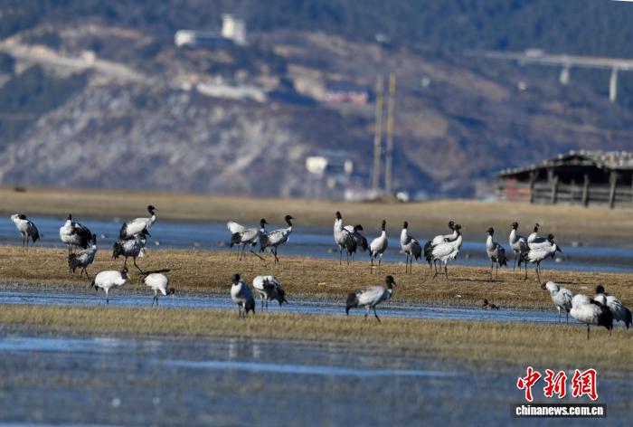 1月7日,一群黑颈鹤在纳帕海觅食。陈志明 摄
