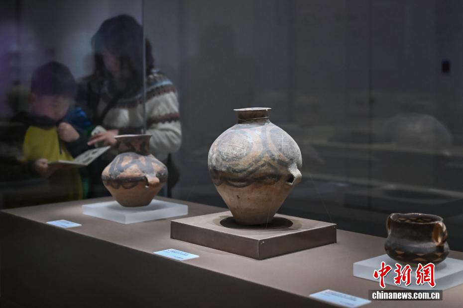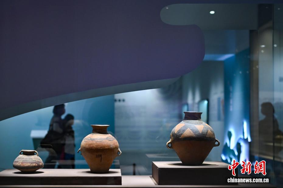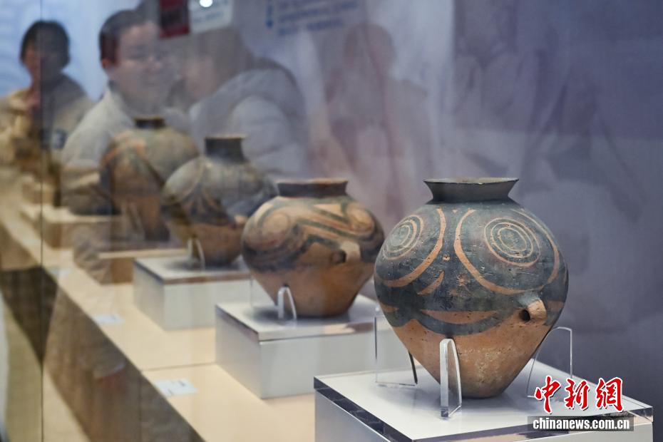 图为展出的新石器时代马家窑文化马厂类型波折纹双耳彩陶罐(右)、四大圆圈纹双耳陶壶(右二)等文物。中新社记者 泱波 摄