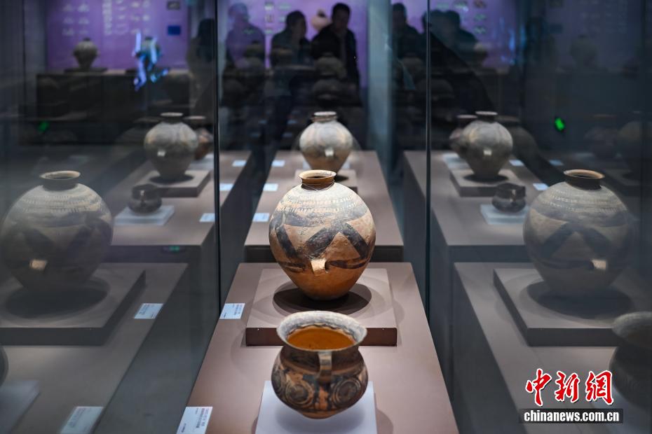 图为展出的新石器时代马家窑文化马厂类型圆圈网格纹双耳彩陶罐(前排中)、连珠折线纹双耳彩陶壶(二排中)等文物。中新社记者 泱波 摄