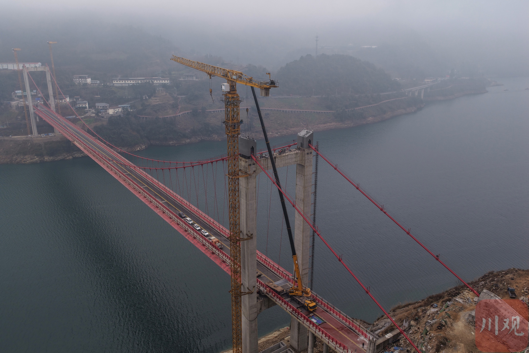 2026年1月19日,国道317线友谊隧道至汶川映秀段改建工程紫坪铺特大桥施工现场,工人正在大桥主塔塔冠吊装。