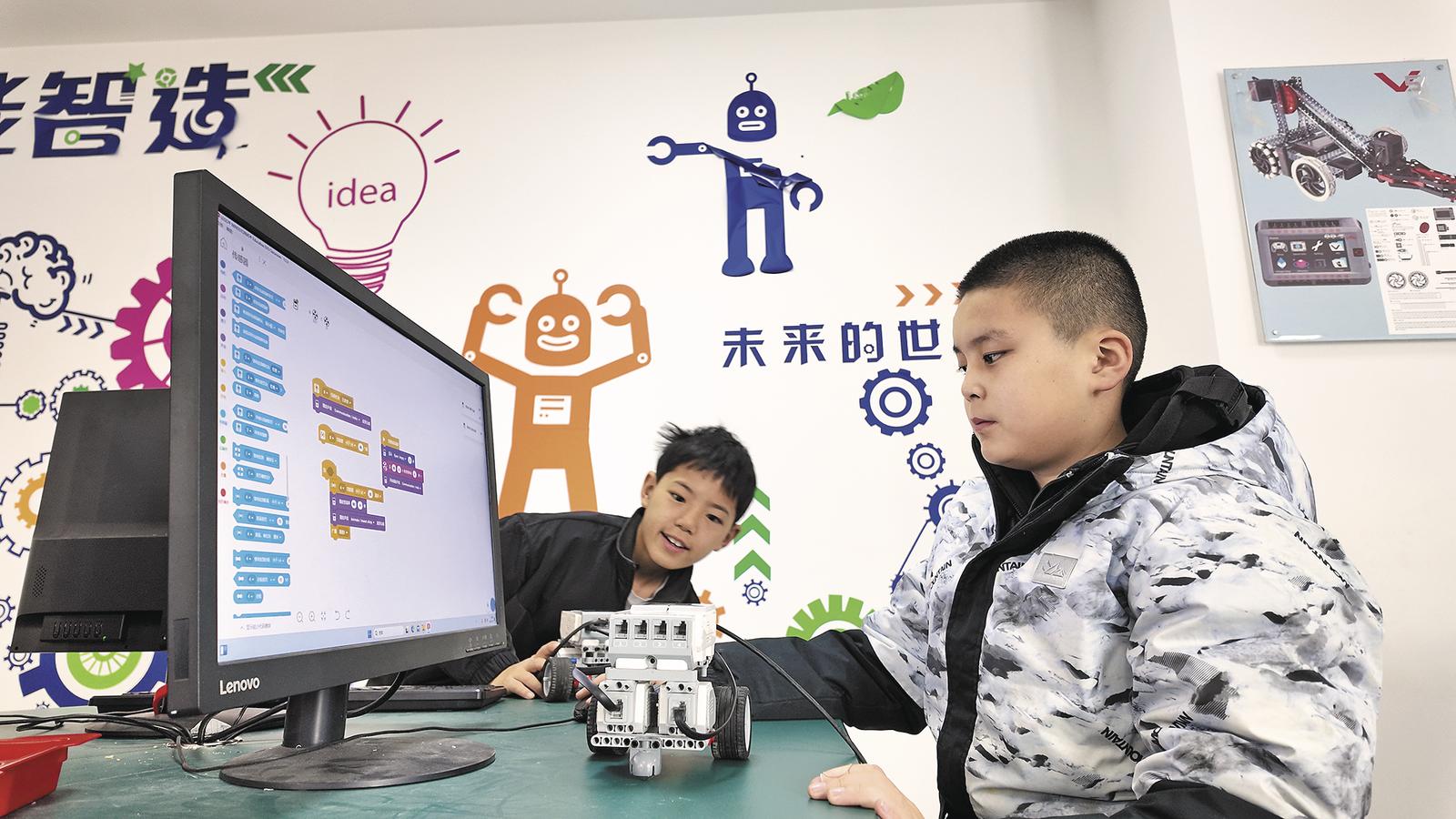 学生体验机器人编程课的乐趣。顾植霞 摄