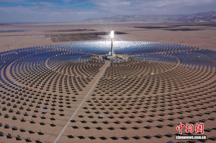 图为航拍位于青海省海西蒙古族藏族自治州格尔木市的中国绿发海西州多能互补集成优化国家示范工程中的光热发电项目。(无人机照片) 张忠苹 摄
