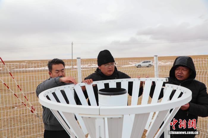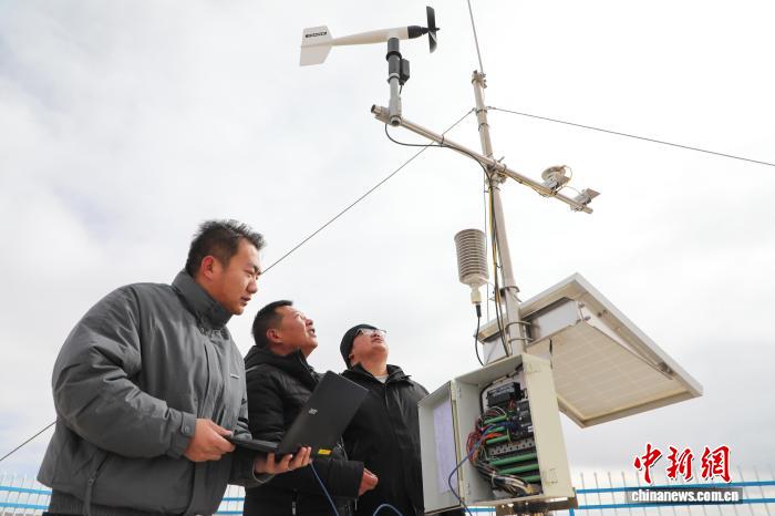 2月8日,青海玛多,气象局工作人员祁润民(左)、普布桑珠(中)和陈海宁在扎陵湖乡扎陵湖电厂气象观测站进行设备维护。中新社记者 马铭言 摄