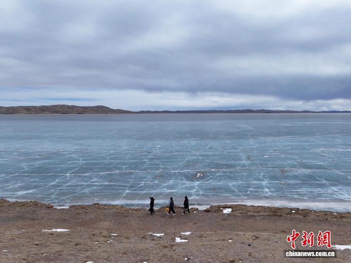 2月8日,青海玛多,气象局工作人员行走在鄂陵湖畔。(无人机照片)中新社记者 马铭言 摄