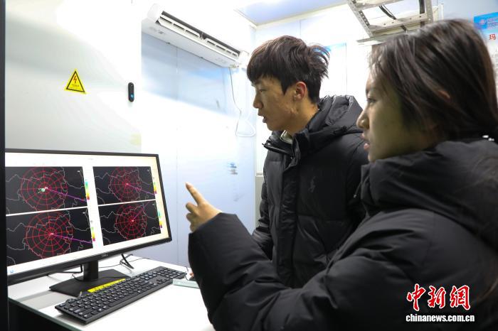 2月8日,青海玛多,气象局“00”后工作人员马伟(左)和窦佳玲进行雷达设备的维护。中新社记者 马铭言 摄