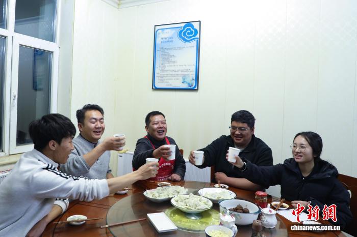 2月8日晚,青海玛多,气象局工作人员一起就餐。中新社记者 马铭言 摄