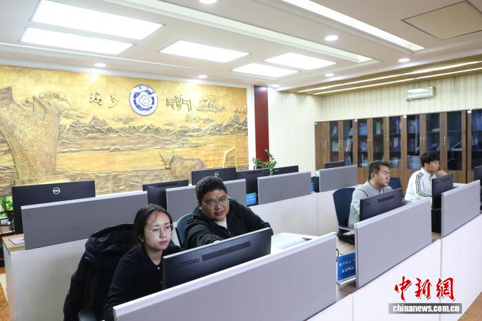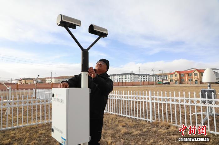 2月8日,青海玛多,气象局工作人员普布桑珠在玛多国家基准气候站内检查设备。中新社记者 马铭言 摄
