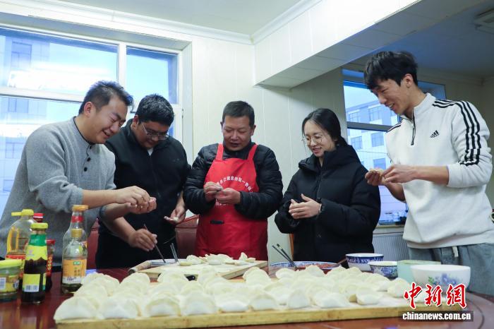 2月8日晚,青海玛多,气象局工作人员包饺子,为小年及新年坚守岗位的同事准备餐食。中新社记者 马铭言 摄