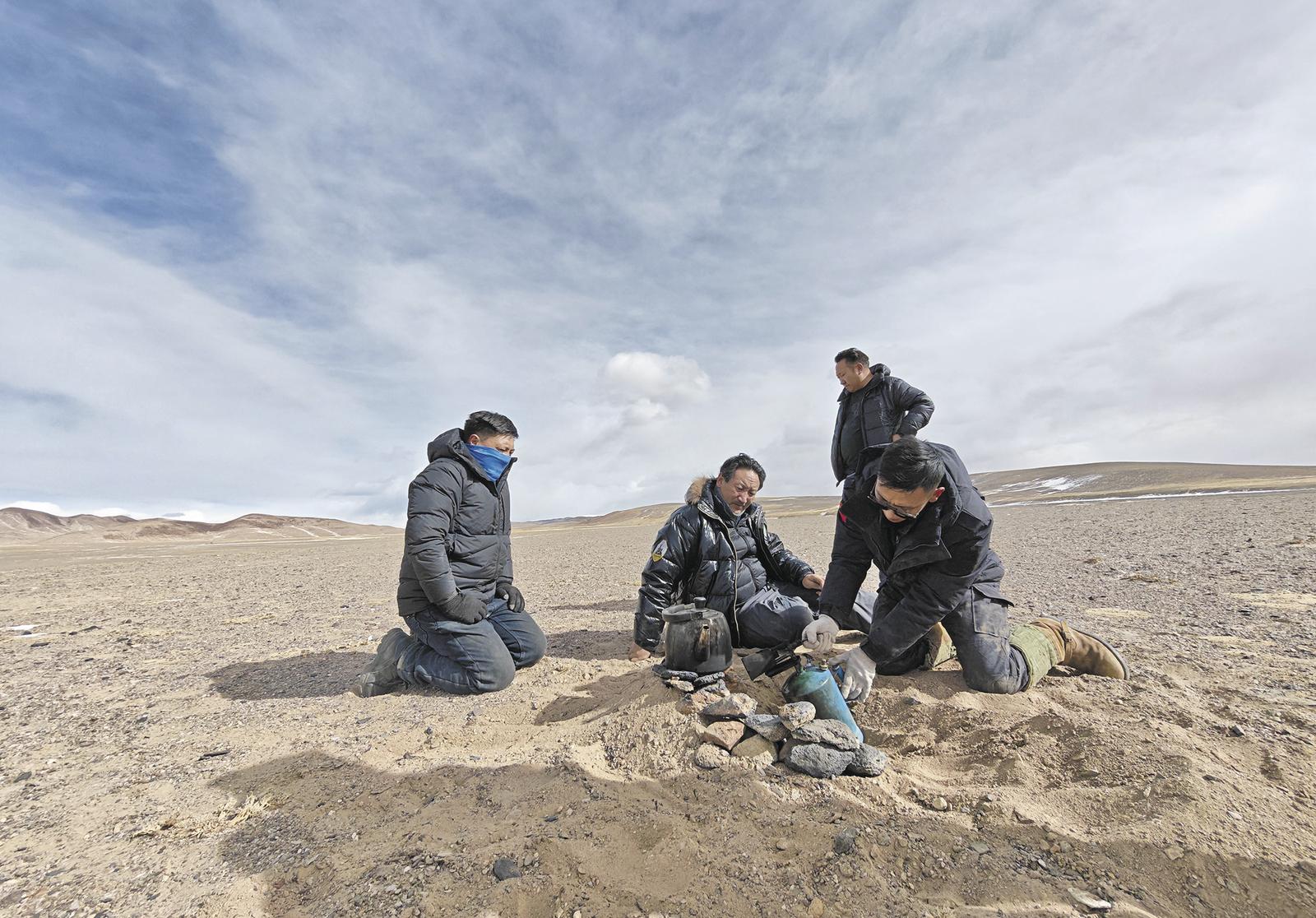 巡山队员在勒斜武旦湖畔烧水。