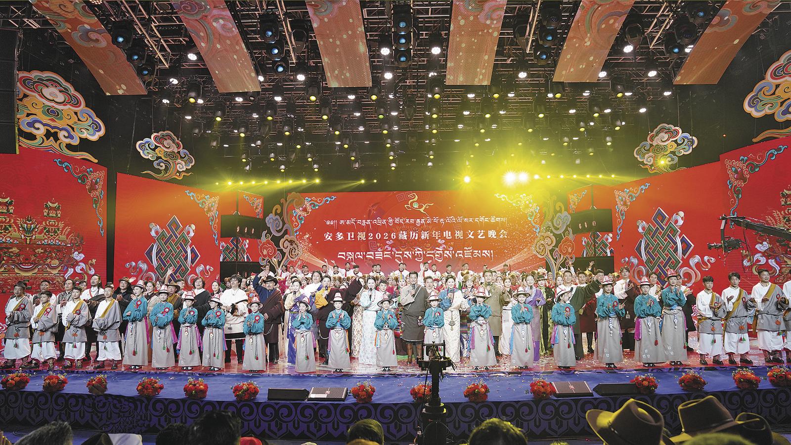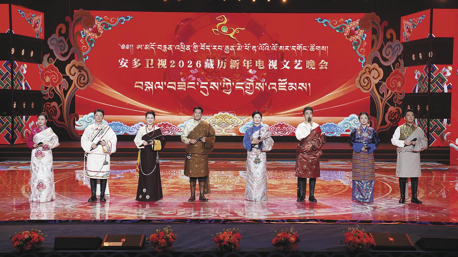 作为一名民族语广电人,我全程见证了安多藏语卫视2026年藏历新年文艺晚会《跃马扬鞭幸福年》的录制与呈现。晚会长达3小时,内容丰富、类型各异的27个节目引领观众的心绪层层递进、起伏有致,令人目不暇接、赏心悦目,既有对民族文化的传承弘扬,也有对时代发展的深情礼赞,更有对家国情怀的赤诚抒发。整场晚会以“铸牢中华民族共同体意识、推进中华民族共同体建设”为主线,从开场的激情昂扬到中场的深情厚重,再到尾声的满怀期许,起承转合间脉络清晰、立意深远,不仅刻在了我的脑海里,更让我真切感受到这个已经伴随高原千万观众走过37个春秋,让无数海内外藏族同胞热切期盼的“藏历新年夜文化大餐”,是如何在传承中创新,在坚守中绽放新的光彩。