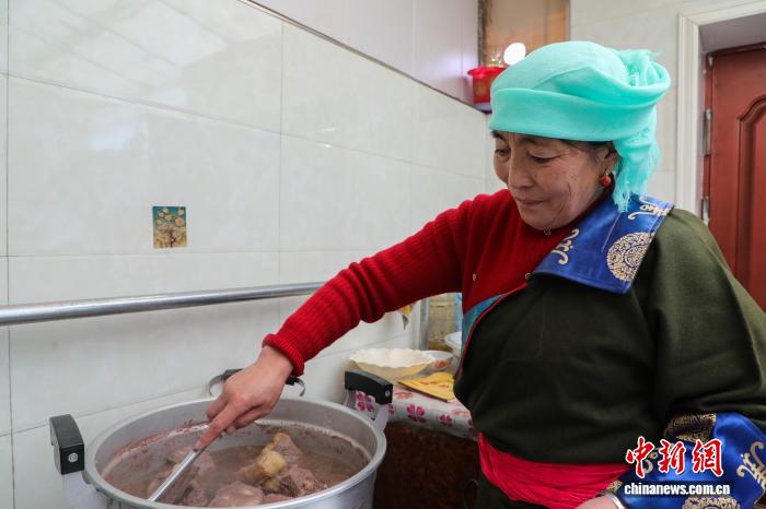 2月16日,中国农历除夕,卓玛措煮牦牛肉准备新年餐食。中新社记者 马铭言 摄