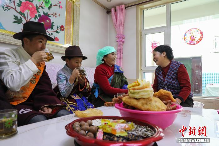 当农历春节遇上藏历新年(2月18日藏历新年初一),青海省西宁市湟源县日月藏族乡,村民们煮牦牛肉、包饺子、摆“卡塞”等藏式点心,走亲串友喜迎新春佳节。