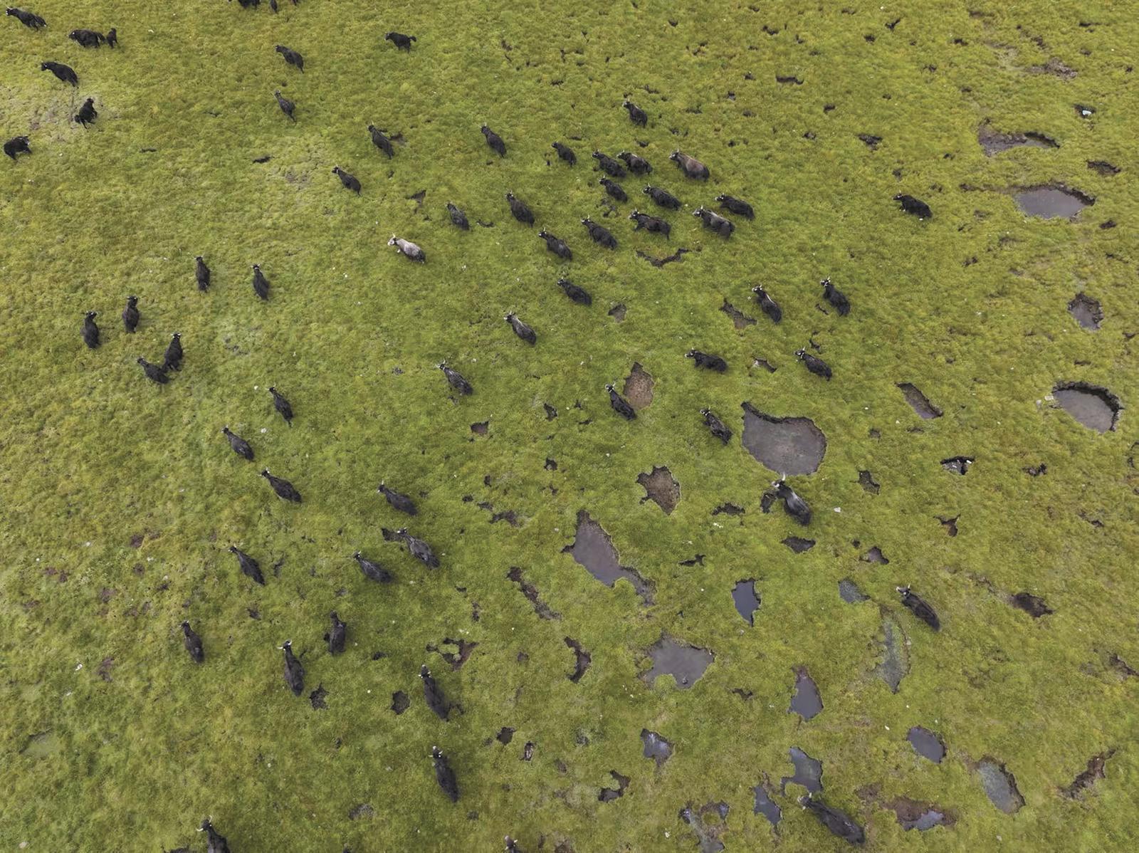 治多草甸上,牦牛群如移动的风景。