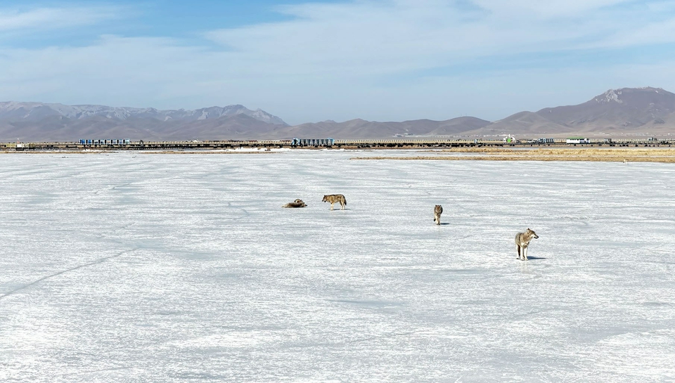 1月28日,有工作人员在巡护过程中,在封冻结冰的花湖湖面上拍到有狼群活动。